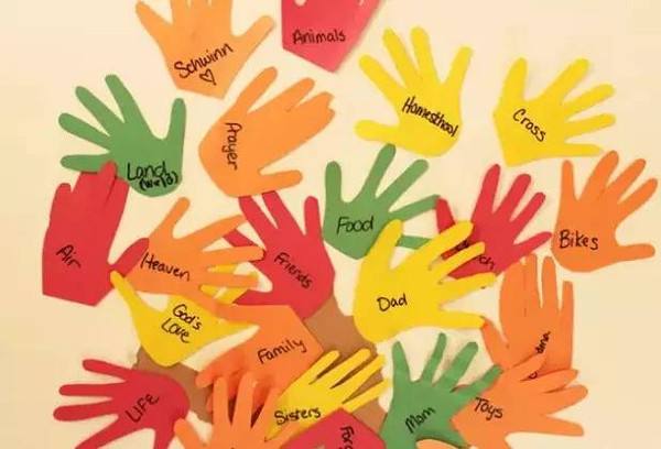 將手放在彩色紙上,對照著剪出每個人的手型,寫上名字。再剪出樹干,將“手掌們”貼在上面,感恩樹就成型了,是不是很容易。