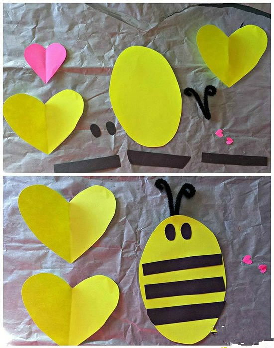準備一張黃色紙和一個紙盤。將黃色紙剪成方塊狀,覆蓋在紙盤上,打造成小蜜蜂的身體。再用棕色紙剪成條狀,三條即可,粘在黃色紙塊上方,形成層次感。接著用白色紙剪小翅膀,棕色紙剪小腦袋,粘在一起,就大功告成了。